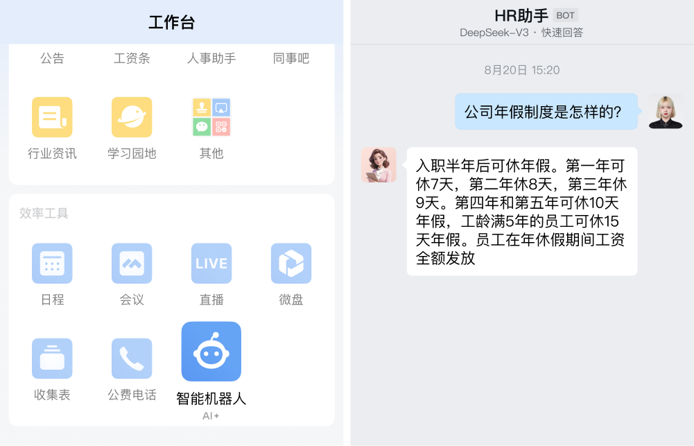 可创建和管理智能机器人,让机器人在公司制度咨询、业务信息查找等场景中帮助回答员工疑问。
