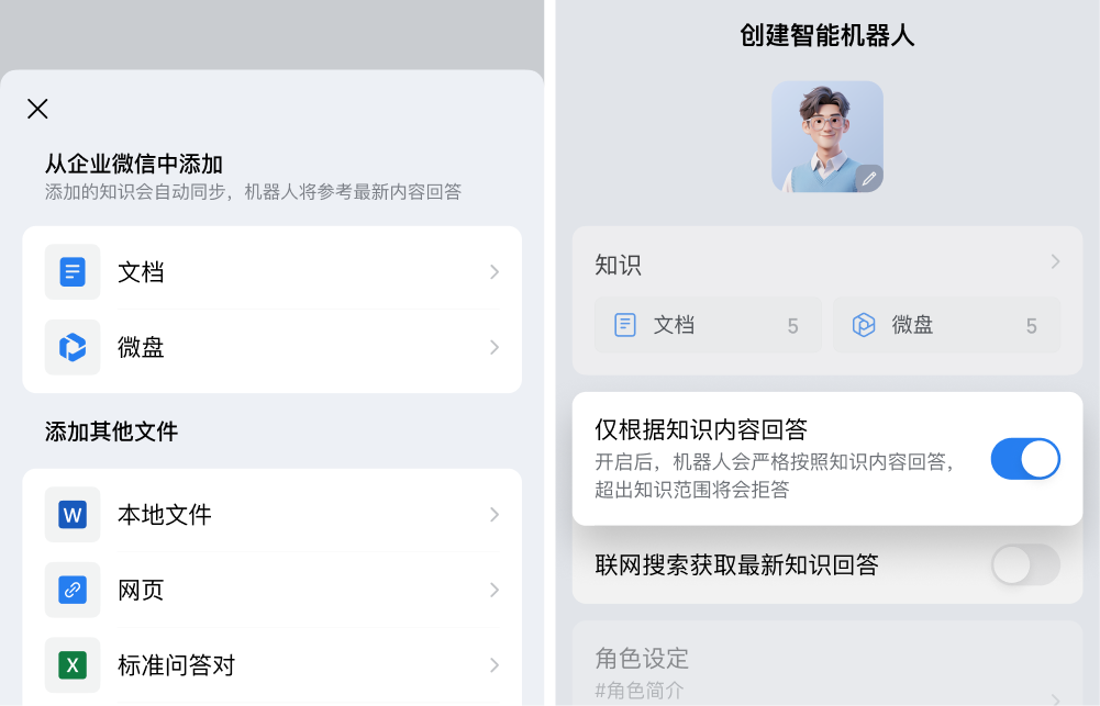 - 可以将企业微信文档、微盘空间中的业务知识添加到机器人,让回答更精准,还支持本地文件、问答对、API等多种方式添加知识。