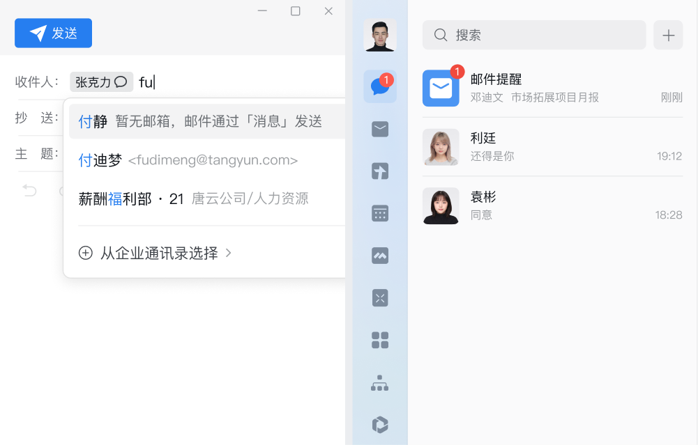 - 支持给所有同事发邮件,即使对方没有邮箱地址,也可以通过消息收到邮件。