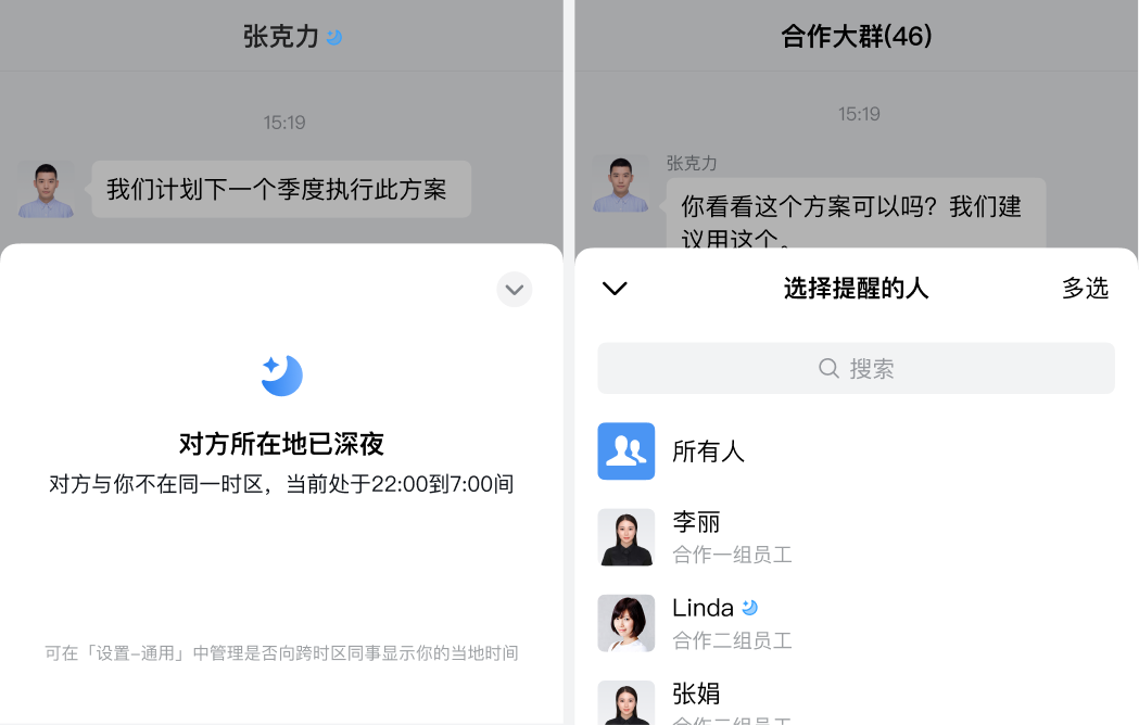 - 与跨时区同事聊天时,可以看到对方是否处于深夜,跨境沟通更高效。