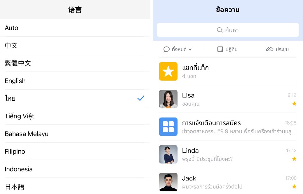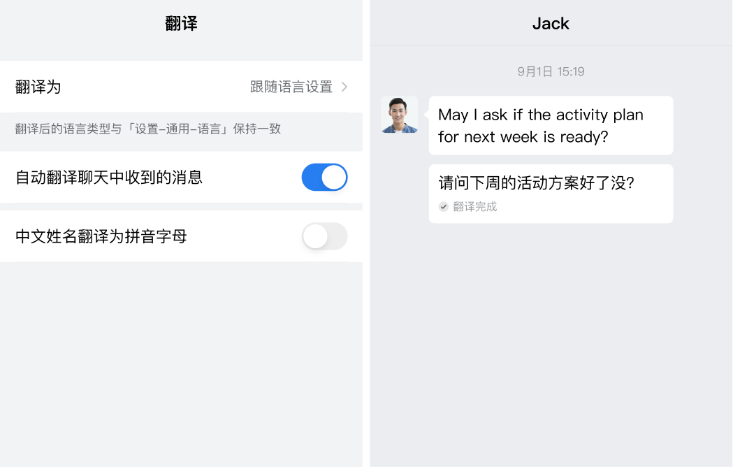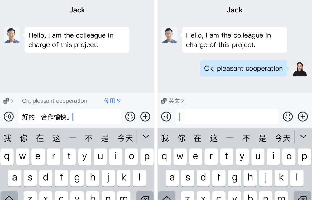 - 聊天中支持边写边译,实时翻译为英语、日语、泰语等6种语言,无需切换翻译工具。