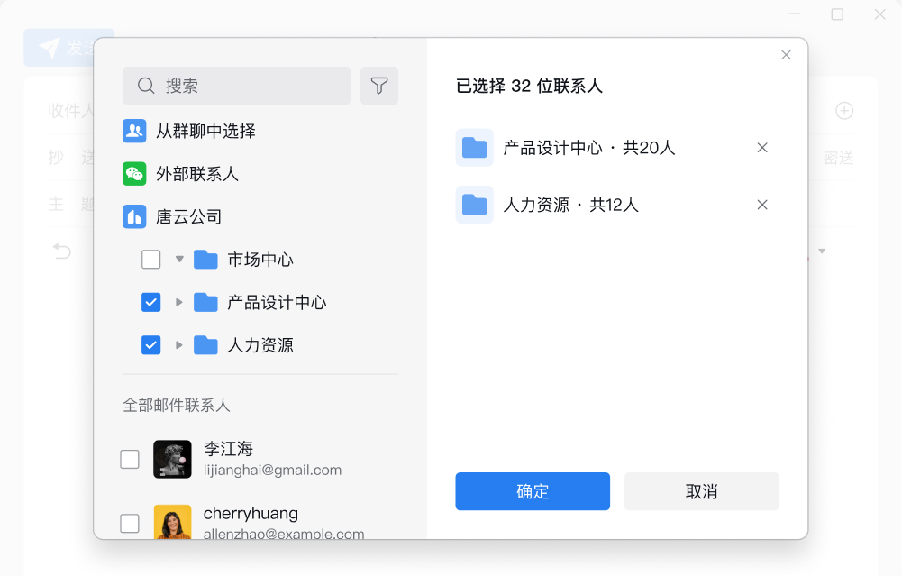 - 写信时,可以直接选择整个部门作为收件人,方便给部门发送通知、汇报等邮件。