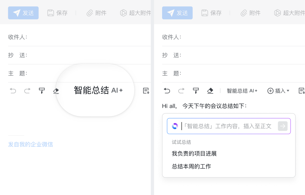 - AI可以总结聊天、文档、会议、邮件等分散的工作内容,插入邮件正文,用于总结我负责的项目进展、本周工作等场景,提升我的写信效率。