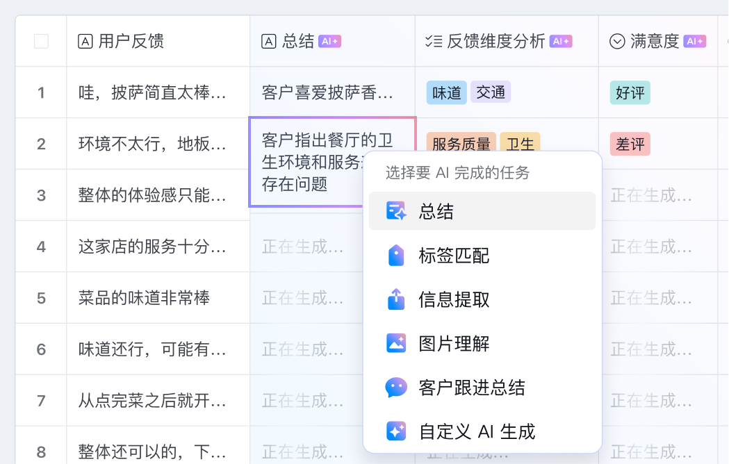 - 支持使用 AI 字段对智能表格的数据进行分类、总结、信息提取、标签匹配、图片理解。