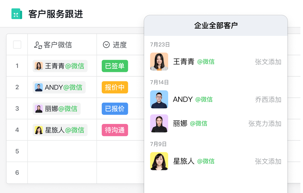 - 智能表格可以轻松管好微信上的客户。成员添加客户的微信后,智能表格自动建档,记录客户添加人、添加时间。