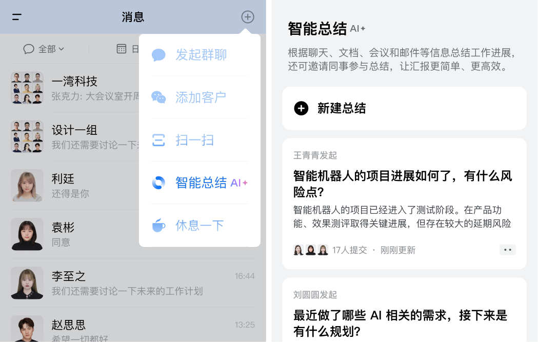 - 工作中的任何进展,都可以根据企业微信内的聊天、文档、表格、智能表格和会议、邮件等信息,自动总结。