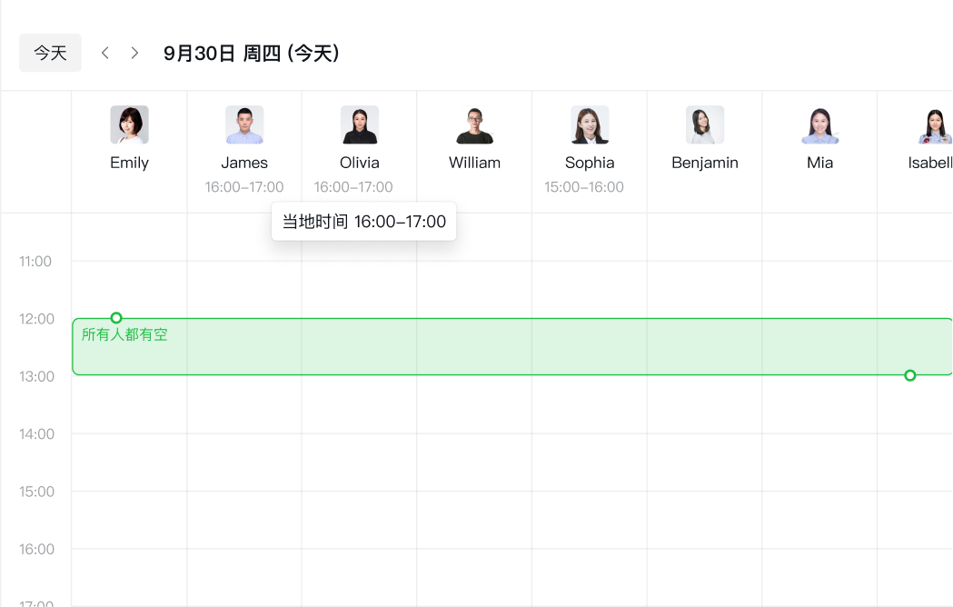 - 新建日程或预定会议时,可以看见与自己不同时区同事的当地时间,跨时区协作更方便。
