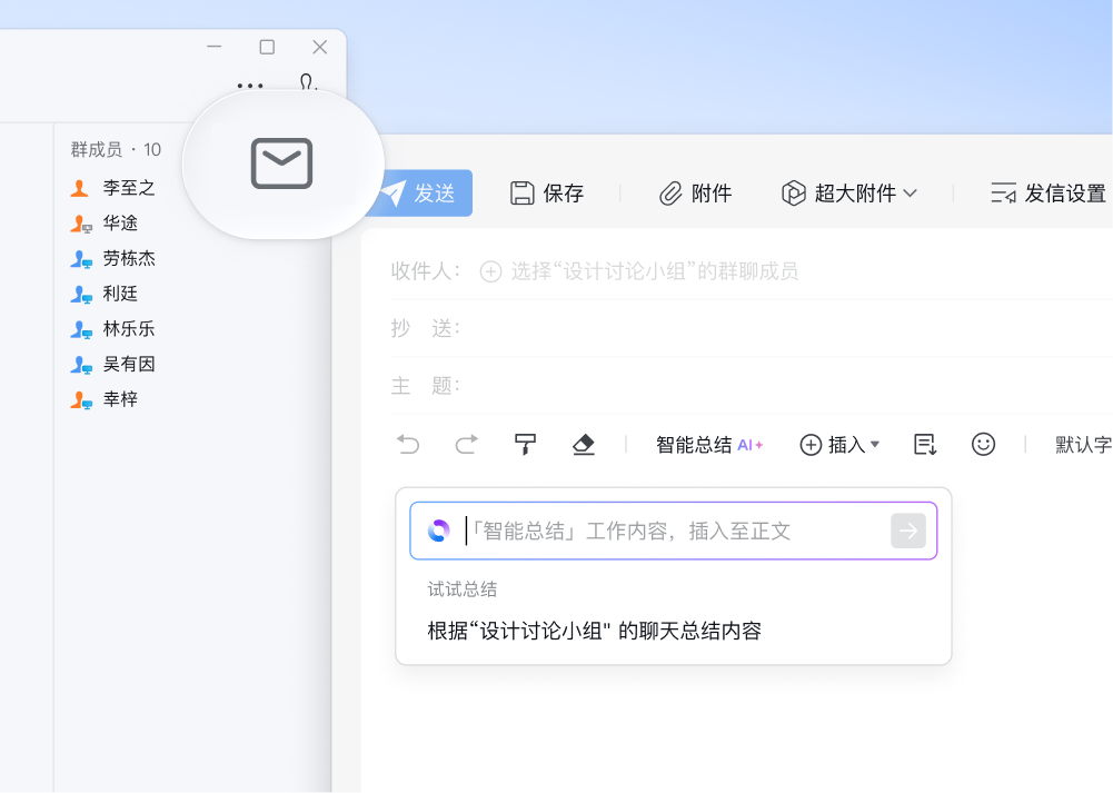 - 收到的邮件可以转发到群聊中讨论;群内讨论完工作,也可以一键给所有群成员发邮件,无需手工填写收件人。