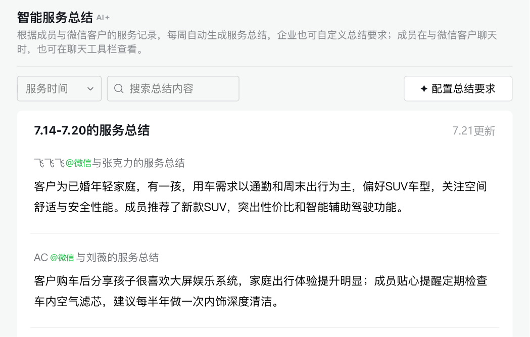 - 根据成员与微信客户的服务记录,AI将每周自动生成服务总结,企业也可自定义总结要求。