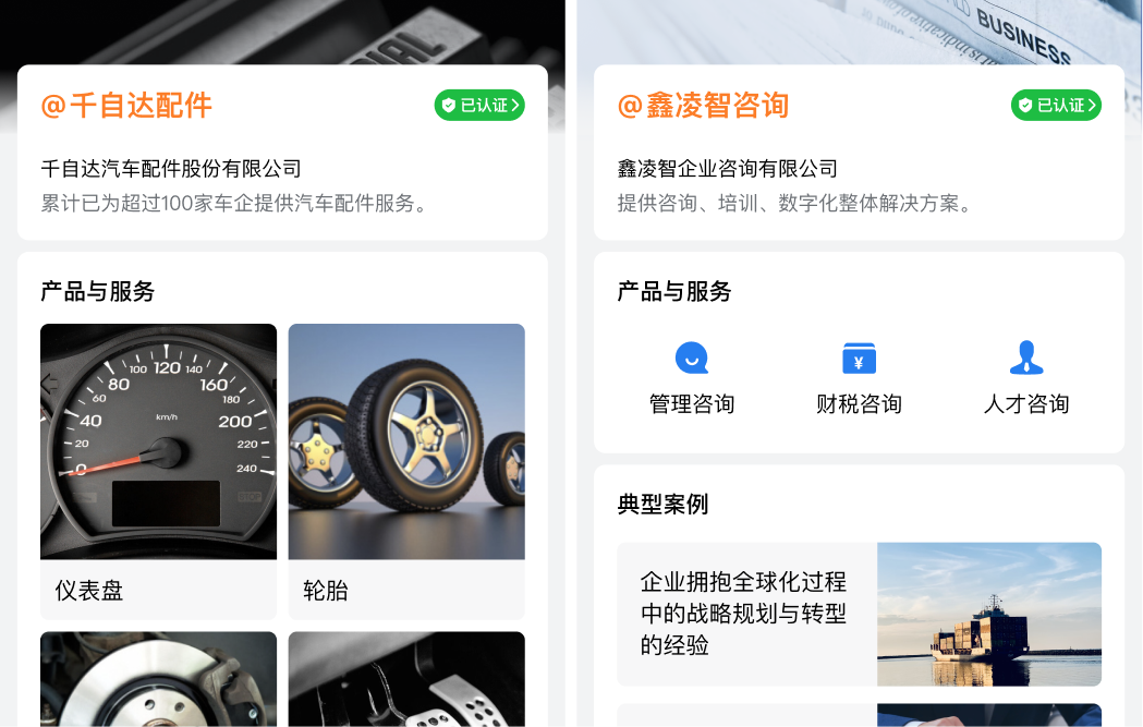 - 企业可按行业选择模板,完善产品/服务、客户案例、荣誉资质等信息,展现企业实力。