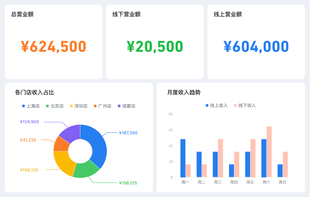 - 业务数据汇总到智能表格,使用仪表盘就可以通过柱状图、数字卡等图表直观展示关键业务指标,图表随数据变化实时更新。