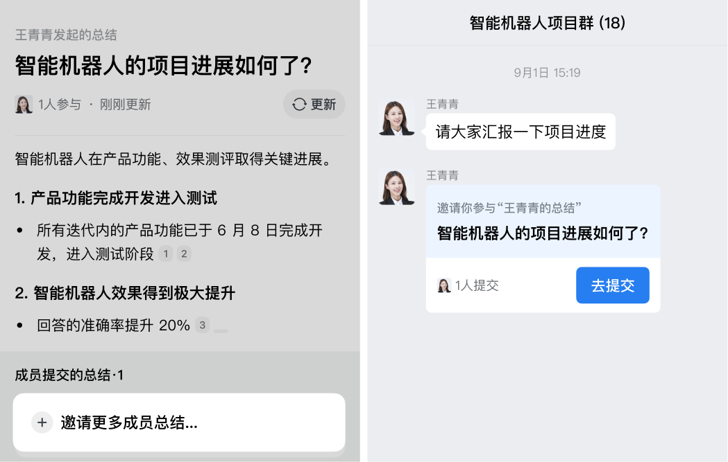- 支持邀请同事参与总结,将所有人的内容汇总成一份整体的总结,让汇报和协作更简单、更高效。