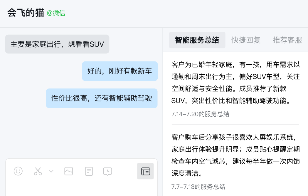 - 成员跟微信客户聊完后,可以一键生成客户跟进总结,提炼客户意向、生成跟进建议,帮助企业提升服务质量。